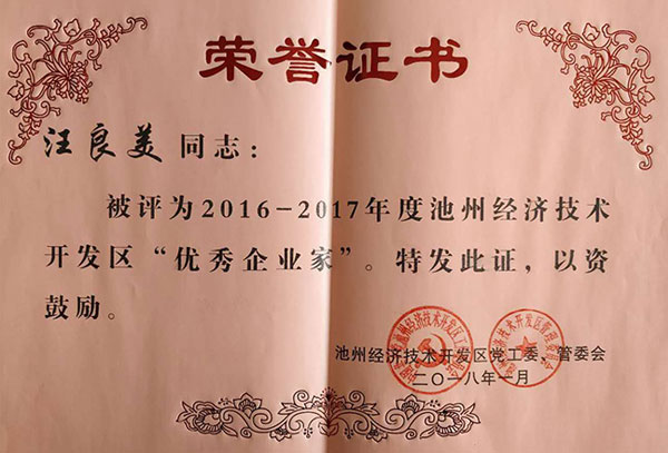2018年1月31日, 池州市經(jīng)濟(jì)技術(shù)開(kāi)發(fā)區(qū)召開(kāi)了2018年度工作會(huì)議, 會(huì)議表彰了2017年度開(kāi)發(fā)區(qū)優(yōu)良企業(yè)(項(xiàng)目)和優(yōu)良企業(yè)家,恒生集團(tuán)繼榮獲“突出進(jìn)步獎(jiǎng)后又”榮獲“創(chuàng)新發(fā)展獎(jiǎng)”,汪良美董事長(zhǎng)再次被評(píng)為2017年度“優(yōu)秀企業(yè)家”。